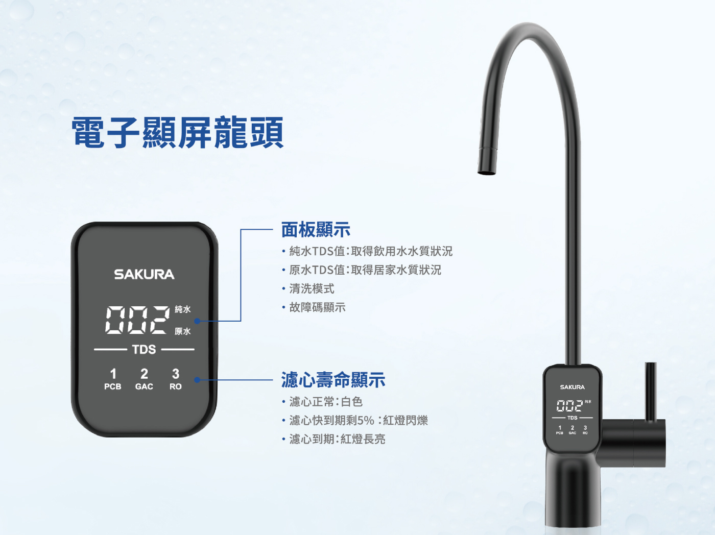 ▸電子顯屏龍頭,智慧顯示純水/原水 TDS 值、清洗模式、故障碼,隨時掌握水質狀況