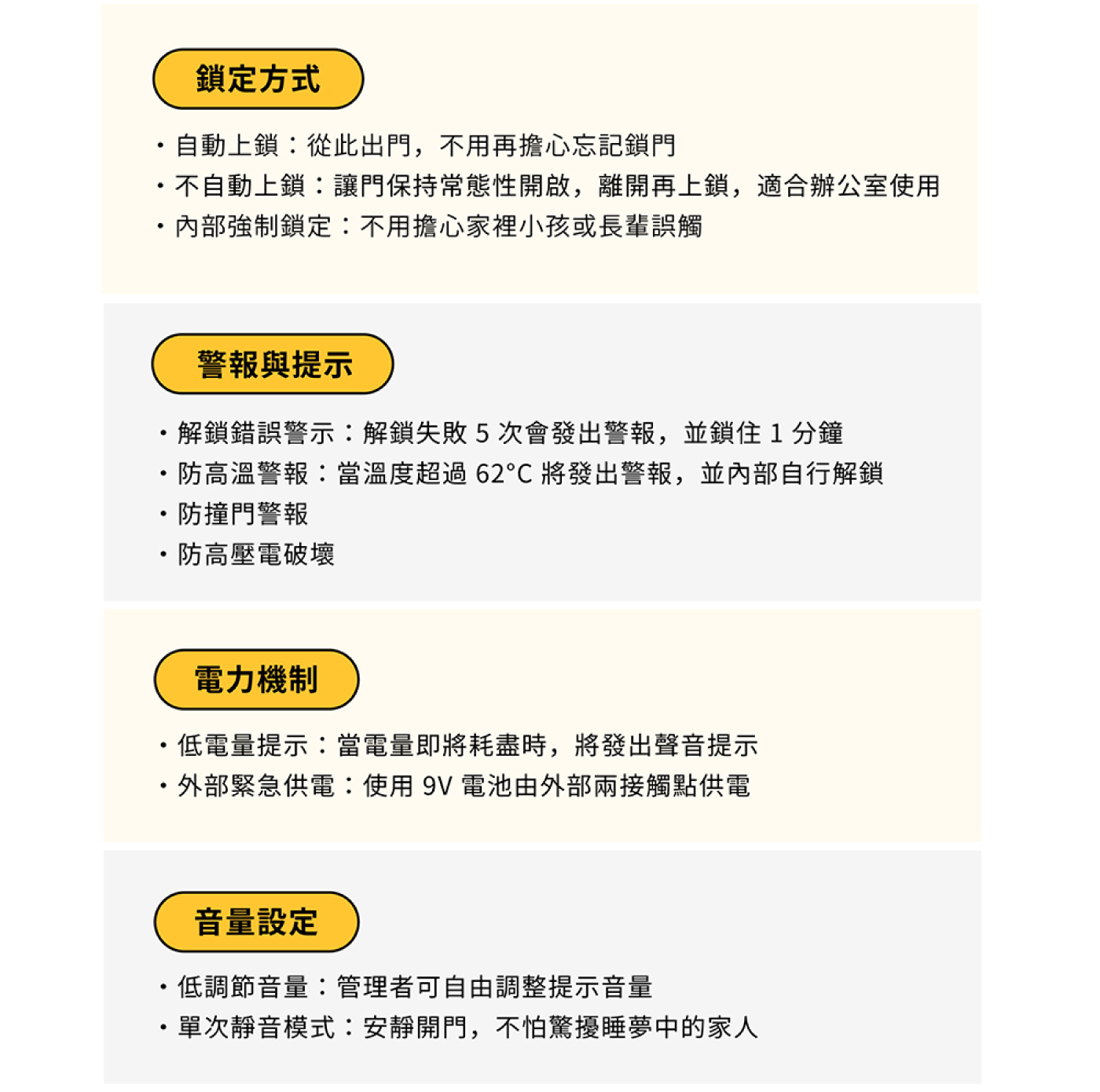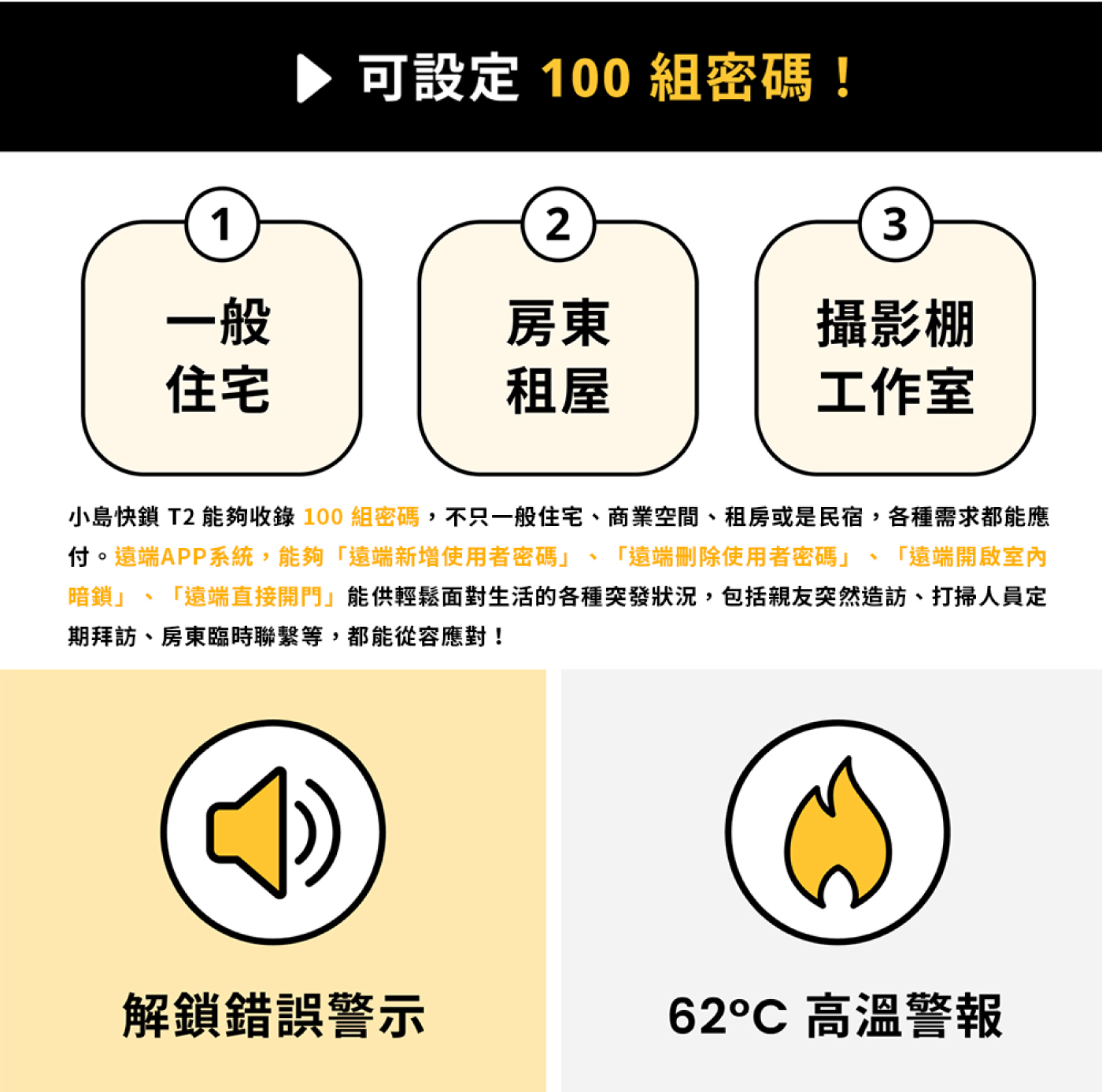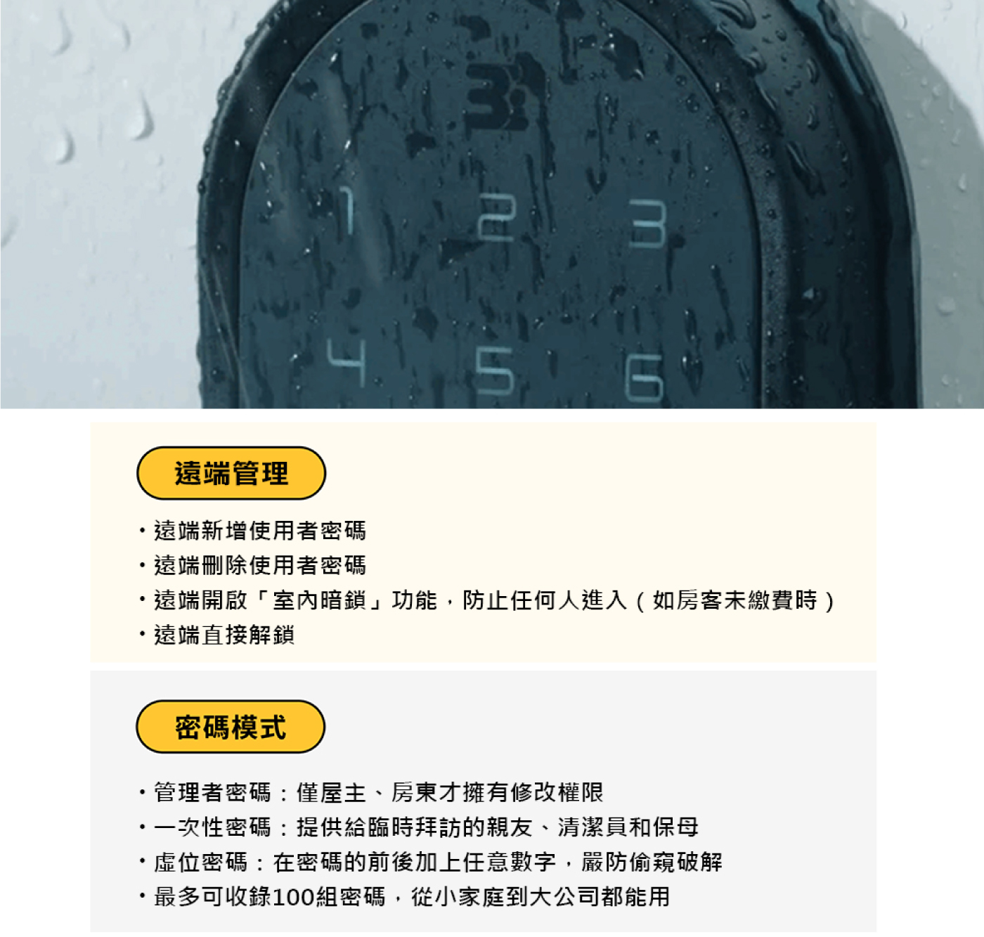 ▸4合1解鎖:密碼(100組)/遠端解鎖/週期性密碼/臨時密碼