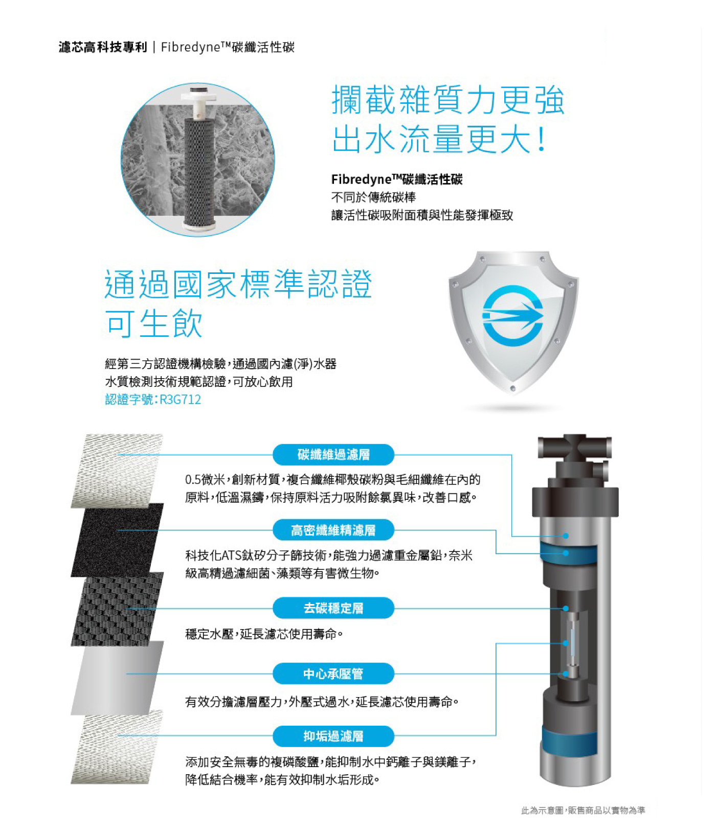▸採用 Fibredyne™ 濕式碳纖活性碳,形成高效濾水功能,有超高處理量與高流量效能