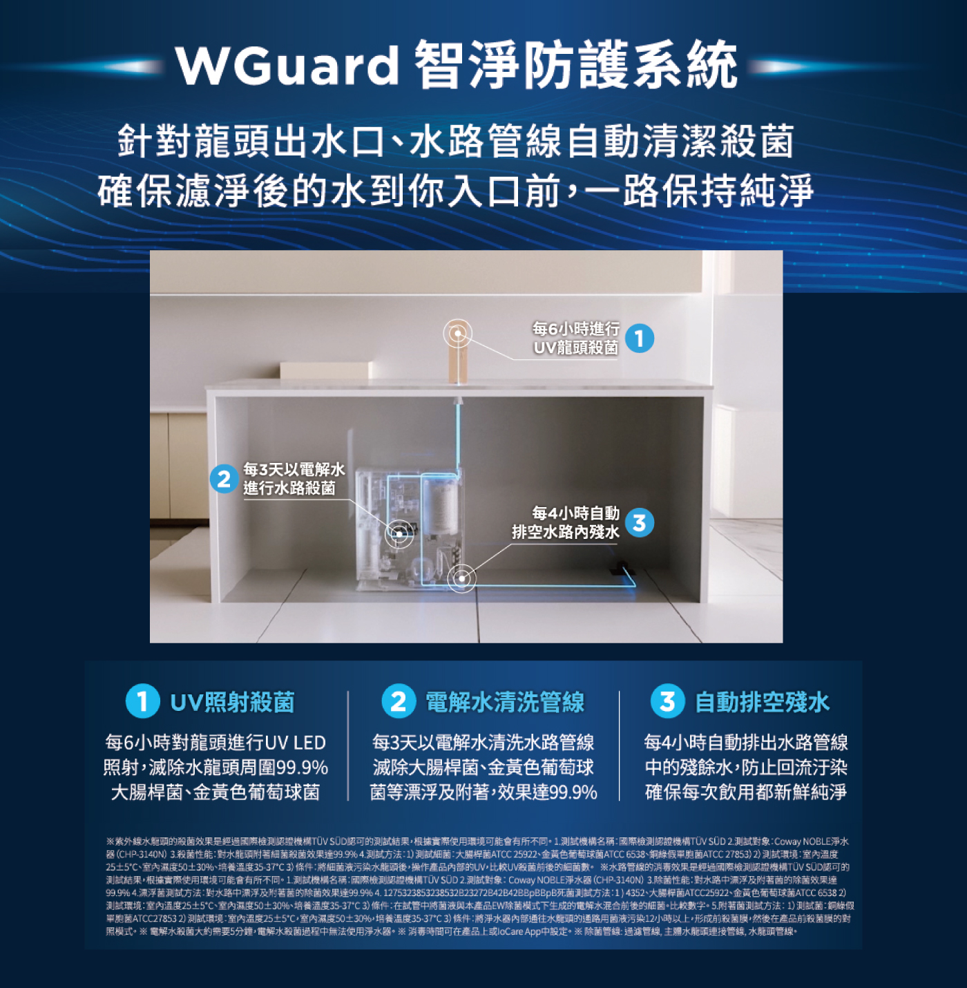 ▸Guard智淨防護系統:UVC+電解技術,強化龍頭與水路純淨衛生