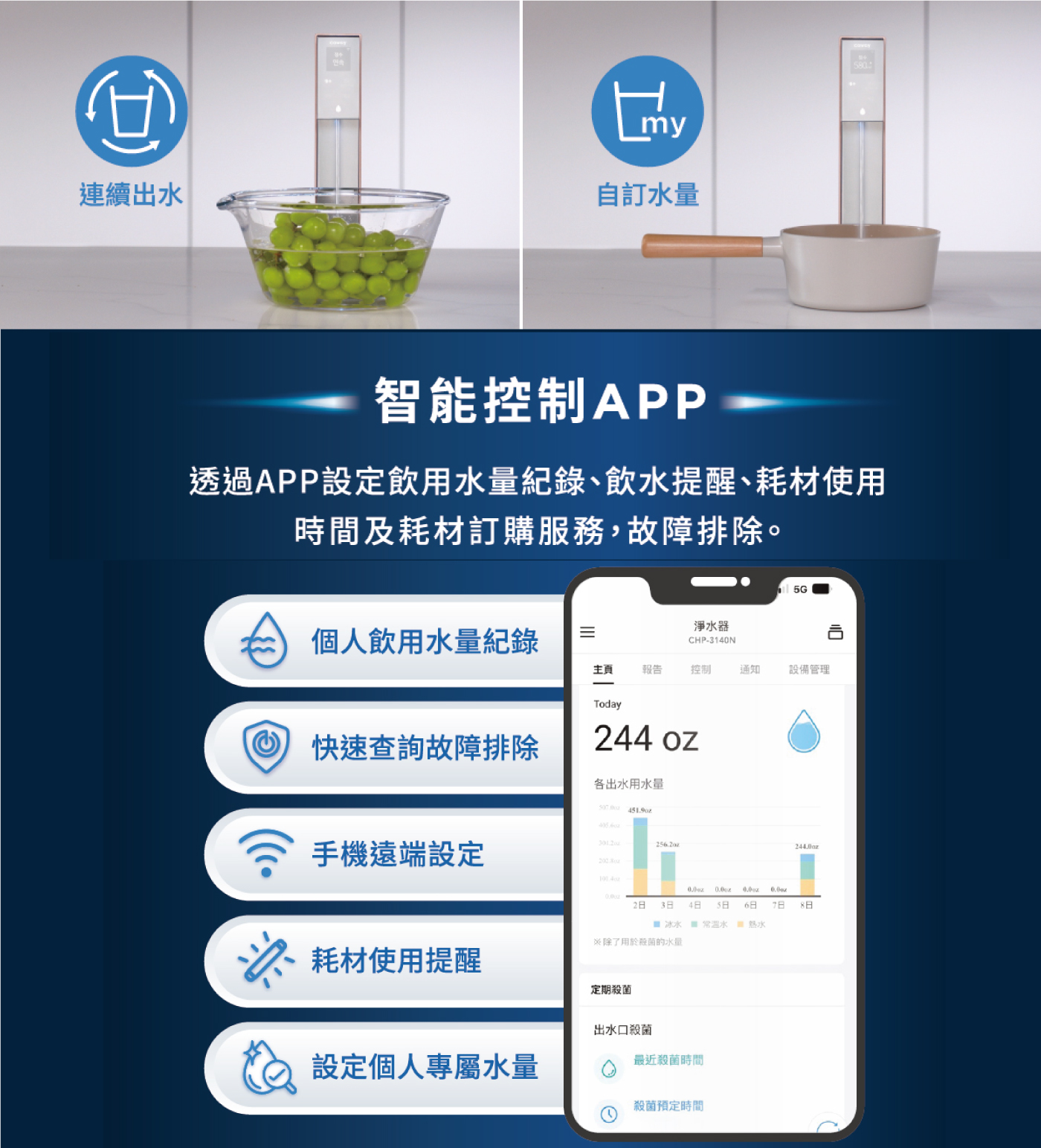 ▸智能控制APP:提供個人化選項、飲水報告、耗材使用提醒,第一個獲得KSA AI+認證的淨水器