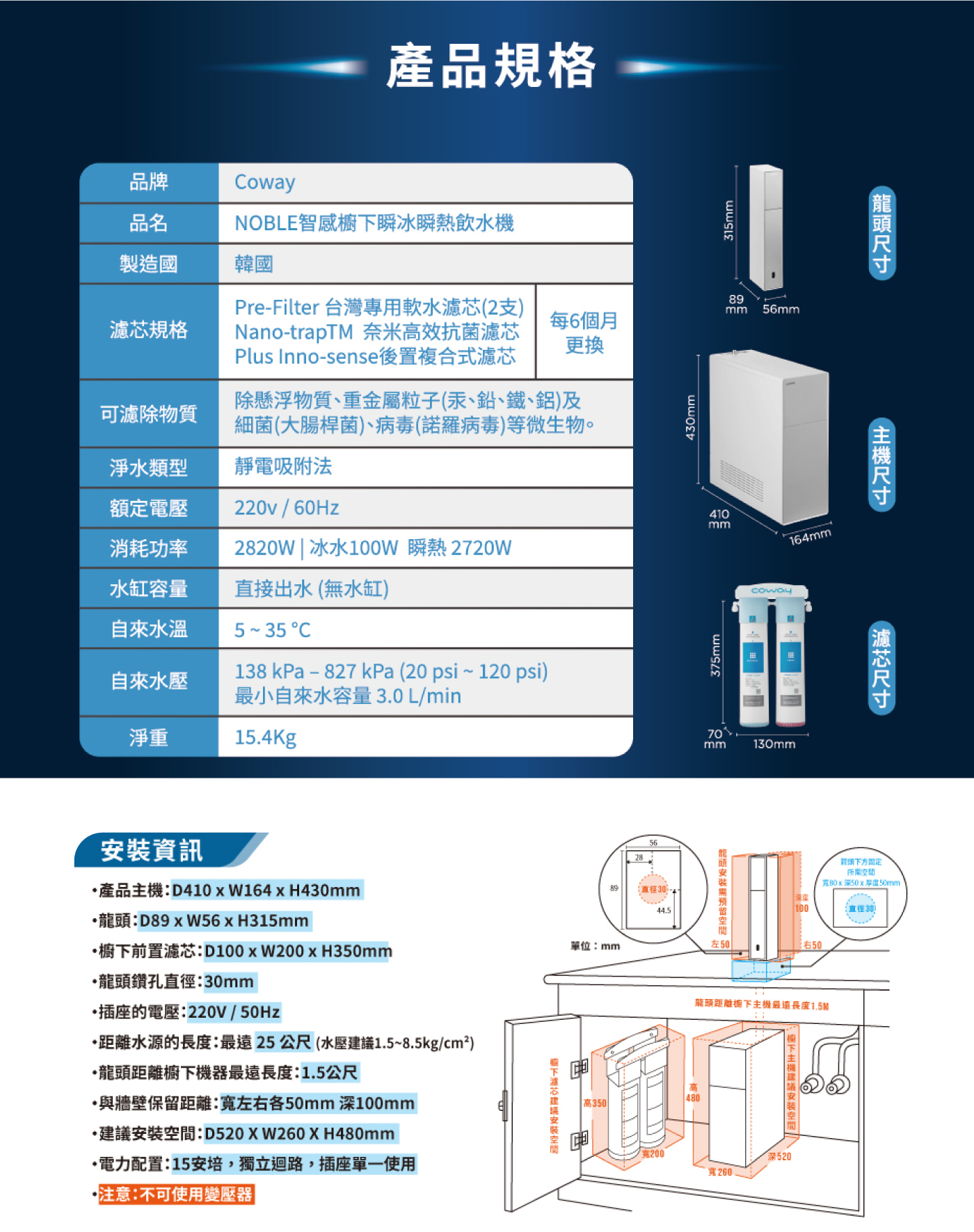 Coway NOBLE 智感櫥下型瞬冰瞬熱飲水機(CHP-3140N)