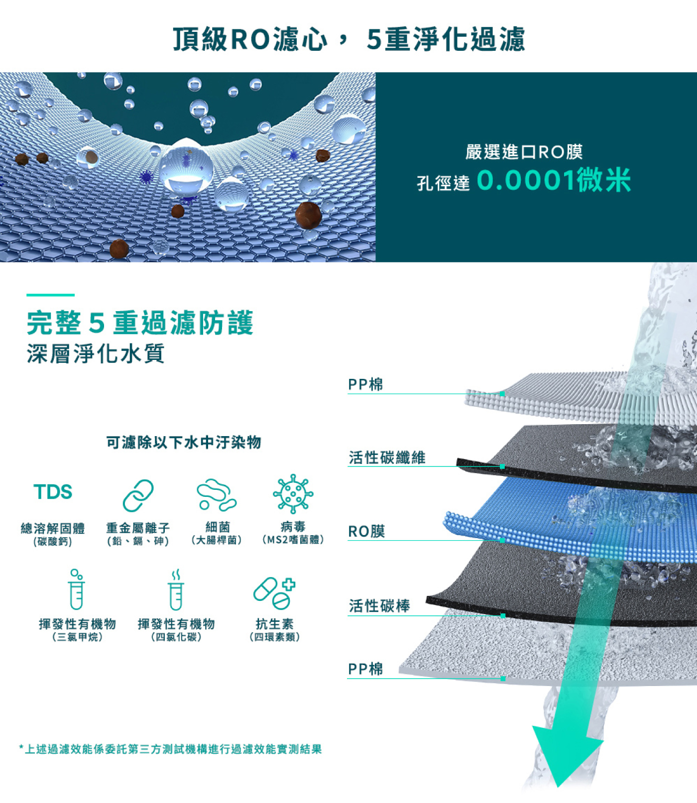 ▸600GPD RO 膜片,有效過濾原水中的溶解性總固體、重金屬離子、有機物、細菌等雜質