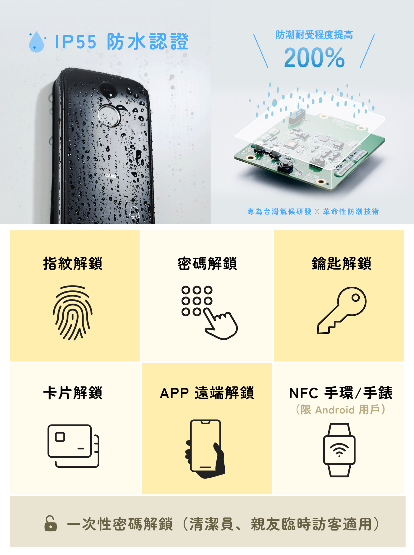 ▸ 7合1解鎖:指紋、密碼、感應卡、NFC 手環、一次性密碼、App 遠端、實體鑰匙