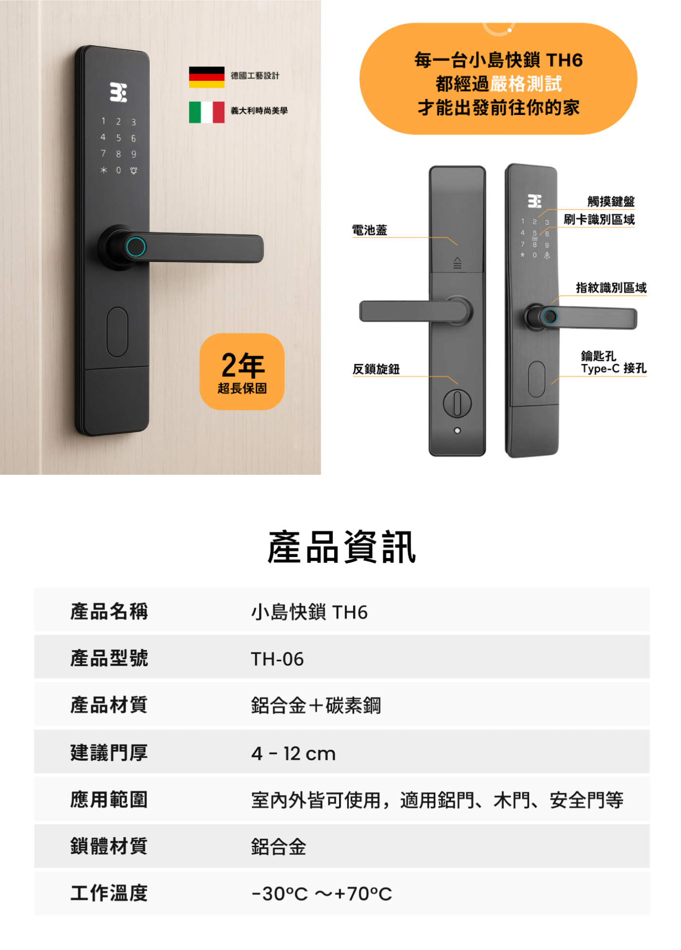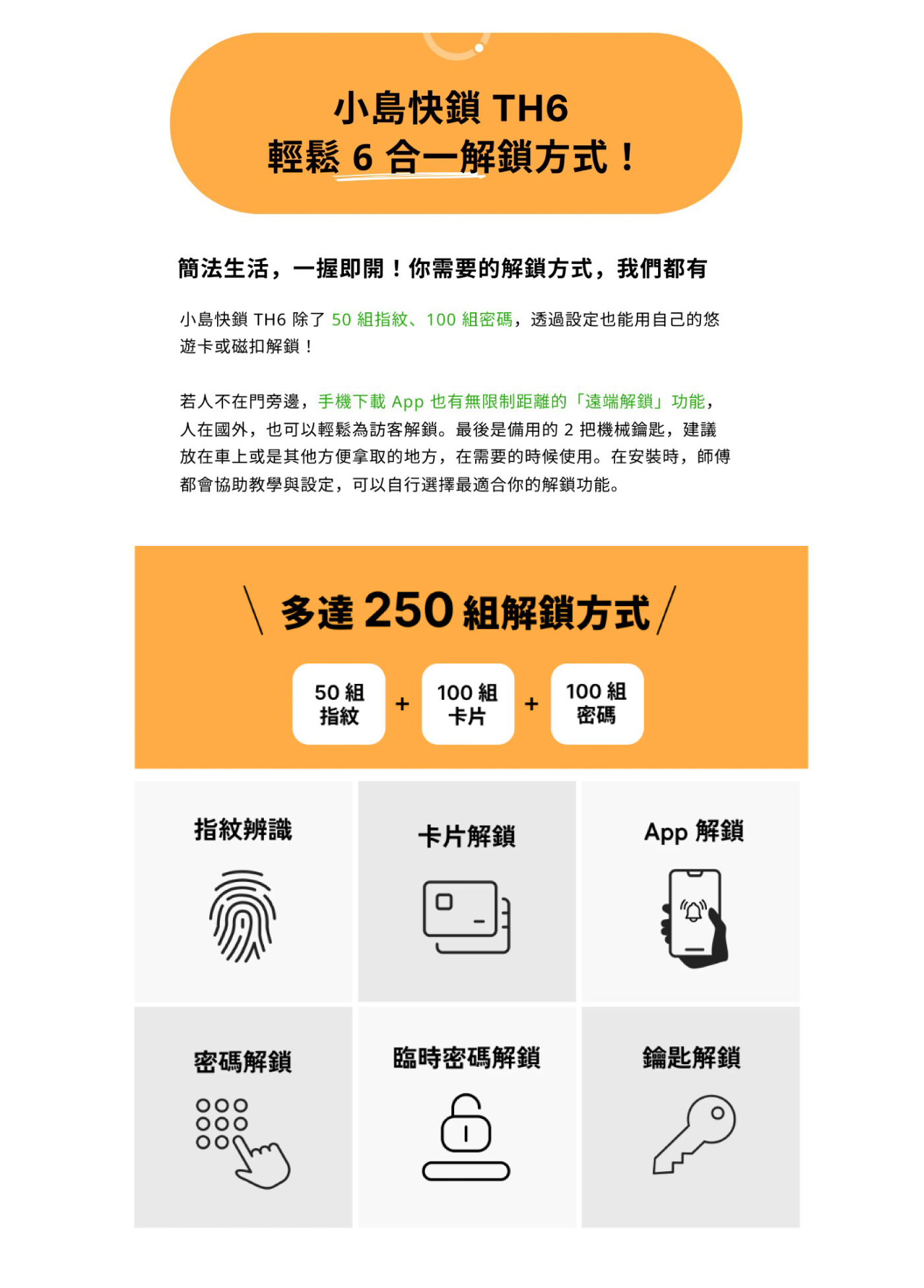 ▸6合1解鎖:指紋辨識、卡片解鎖、APP解鎖、密碼解鎖、臨時密碼解鎖、鑰匙解鎖